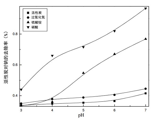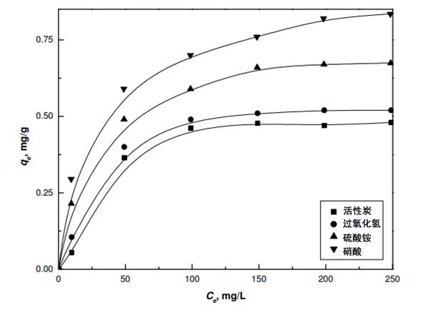 用活性炭和改性活性炭進行平衡吸附實驗,以評估它們使用合成的鎳廢水從水性介質(zhì)中除去二價鎳的能力。通過用0.1g活性炭與50mL濃度范圍為10mg/L至250mg/L的Ni(II)溶液平衡進行實驗,結(jié)果顯示在圖2中;钚蕴康拿靠宋饺萘恐蛋匆韵马樞蛟黾樱夯钚蕴>過氧化氫>硫酸銨>濃硝酸。氧化活性炭的容量增加是由于存在大量酸性基團,其可以與水溶液中存在的陽離子鎳交換它們的質(zhì)子。