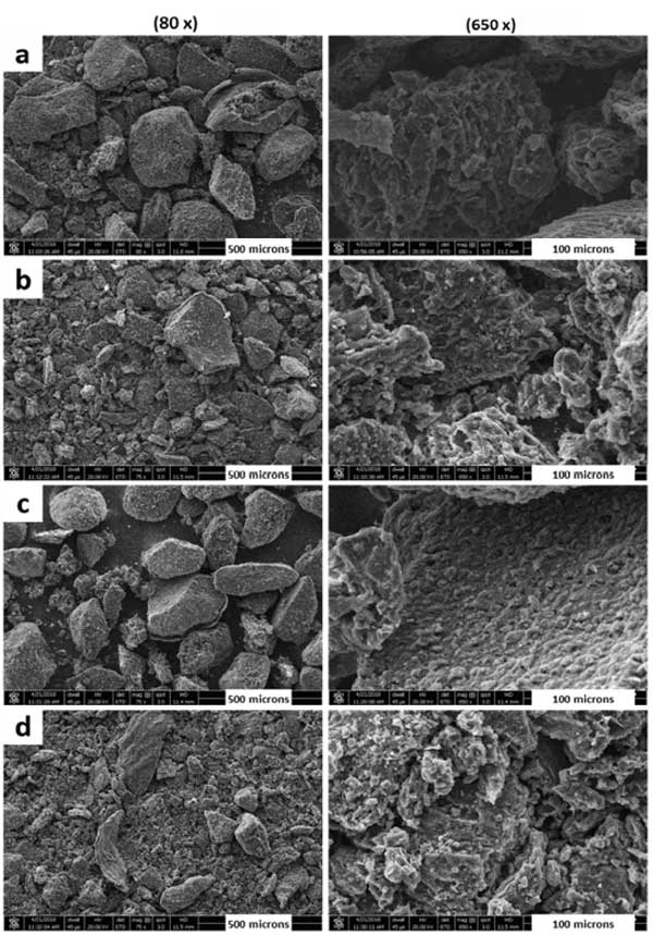 我們使用現(xiàn)代分析技術(shù)來了解制備的活性炭催化劑的真實(shí)性質(zhì),掃描電子顯微鏡(SEM)是查看材料形態(tài)的強(qiáng)大工具。圖1顯示了四種活性炭樣品的SEM圖像。圖像是在兩個(gè)不同的分辨率,以比較不同比例的樣本。評(píng)估不同煅燒溫度的影響是很重要的。圖1的左側(cè)圖像顯示,無論煅燒溫度如何,所有樣品的表面都被各種亞微米大小的顆粒所掩蓋,并且表面上存在許多明顯的解理。不同煅燒溫度下的熱解對(duì)活性炭樣品的形貌影響不大,但有輕微的變化,如一些顆粒從表面被去除,一些解理被侵蝕。此外,從這些SEM圖像可以推斷,這些活性炭材料中的許多微孔結(jié)構(gòu)使其成為任何化學(xué)反應(yīng)中反應(yīng)物相互作用的極好載體。