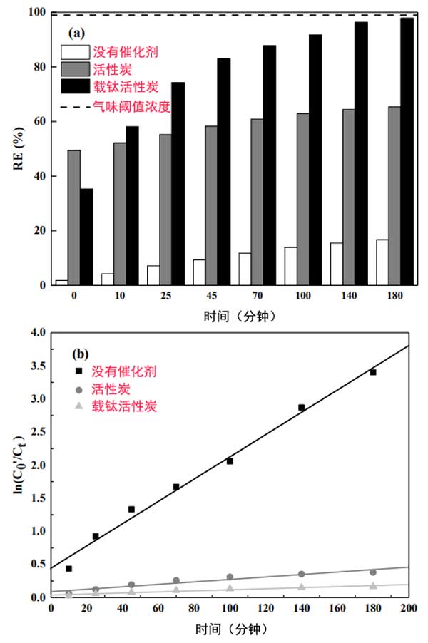 圖2:活性炭和載鈦活性炭在蒸餾水中光催化降解2-甲基異冰片的(a)去除效率和(b)動力學。