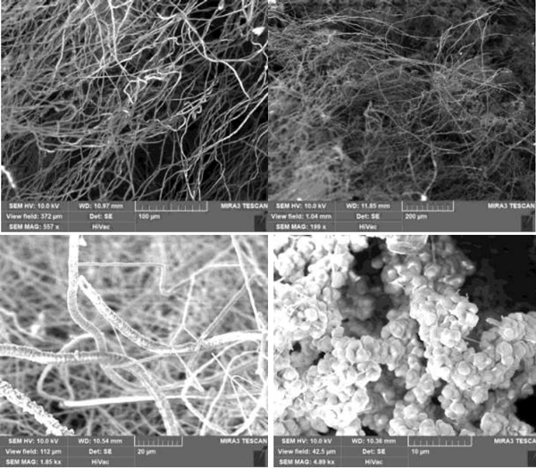 圖4:在圖中描述的不同放大倍數(shù)下獲取的碳化硅纖維的SEM圖像,下面部分的碳化硅成核生長點(diǎn)簇。