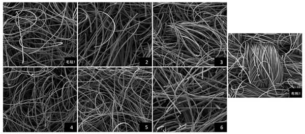 活性炭材料的結(jié)構(gòu)特性,包括編織類型、厚度、密度、BET表面積和微孔率。非織造纖維型比織造活性炭型厚2至4.5倍,但密度不如活性炭,使毛氈型具有海綿狀外貌;钚蕴坷w維材料的BET表面積都很大,微孔面積也比較大。平均微孔面積百分比范圍為83.9%至93.2%,平均孔徑范圍為1.59至1.70nm(<2nm),表明活性炭材料主要是微孔的。BET表面積與微孔面積(r=0.997)呈強(qiáng)正相關(guān),但與微孔面積百分比(r=-0.982)呈強(qiáng)負(fù)相關(guān);钚蕴坎牧现欣w維的組織顯示在SEM圖像中200倍放大倍數(shù)下,毛氈型顯示隨機(jī)排列的松散無紡纖維,而布料型顯示緊密編織的纖維,外觀更致密(圖1)。