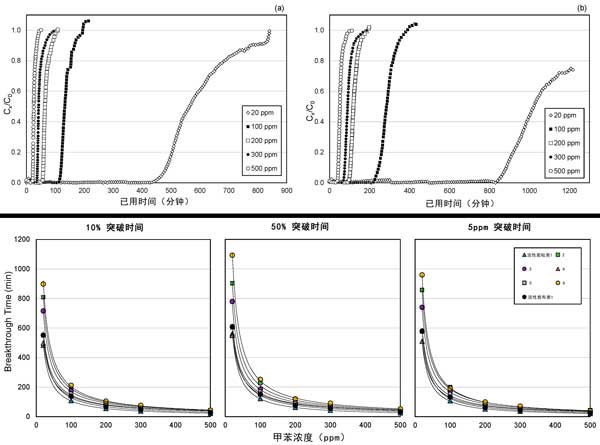 圖2:(a)活性炭濾芯1和(b)6小柱類型的突破曲線(按甲苯濃度),穿透時(shí)間與不同小柱類型的甲苯濃度的函數(shù)關(guān)系。