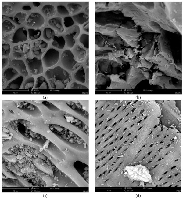在溶劑加載之前的活性炭通過使用掃描電子顯微鏡作為SEM顯微照片進行表征(圖1)。分析表明,不僅研究不同材質活性炭彼此的不同,而且在一種材料中也可能出現不同的結構(圖1a與圖1b、圖1c與圖1d、圖1e與圖1f和圖1g與圖1h)。所有的材料都不是均質的,在所有的原材料中,都可以發(fā)現具有不同孔隙率的顆粒、壓實的塊狀,甚至是纖維結構。材料C1(粒徑0.5÷0.75mm的活性炭)是高度多孔的,顆粒充滿可見孔,直徑為5÷11µm,壁光滑(圖1a),顆粒結構的壁密度較低,但也有很大的表面積(圖1b)。粉狀活性炭(C2)具有較小的(圖1d)和較大的(圖1c)孔,具有光滑(圖1c)和較粗糙(圖1d)的壁和細長的形狀。這兩種材料似乎都具有良好的孔隙率和表面,因此它們應該是非常有效的吸附劑。我們的結果證實,C1和C2在鉭的去除方面都非常有效,去除效率約為97%。C3的多孔性要小得多。雖然有一些顆粒具有相對較高的孔隙(圖1e),但也有較高含量的更致密、相當無孔的塊狀(圖1f)。孔隙結構受到輕微干擾,可能是由植物材料中可能存在的無機化合物晶體造成的(圖1e)。因此,這種結構表明較低的表面和吸附特性。然而,無孔件的表面積似乎很發(fā)達(圖1f)。這是相當虛幻的,因為在使用的所有活性炭中,材料C3的鉭去除效率最低(81%)。最小的大孔材料似乎是C4炭。它由具有緊湊結構的塊(圖1g)和類似于納米管或纖維結構的形式(圖1h)組成。這種材料的多孔性也比C1和C2少,但由于纖維的原因,它的表面應該比C3更發(fā)達,因此它應該具有更好的吸附效率。事實上,這種材料的鉭去除效率略高于C3,但仍低于活性炭C1和C2。根據這些結果,可以得出結論,C1和C2的原材料就具有大孔結構。