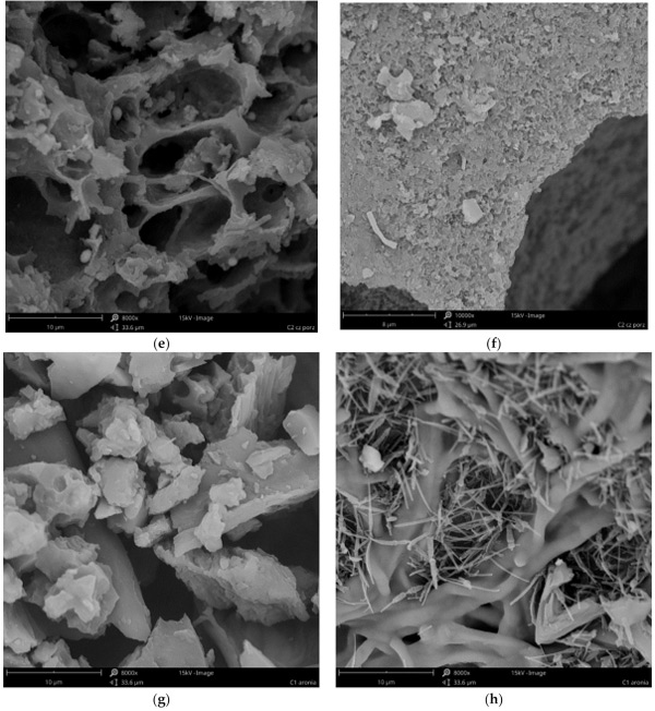 圖1:活性炭的SEM顯微照片(放大倍數8000倍和10000倍(f)),(a,b)C1(粒徑0.5-0.75mm的活性炭),(c,d)C2(粉狀活性炭),(e,f)C3(碳化纖維素),(g,h)-C4(碳化植物)。