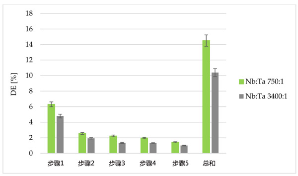 在進一步的研究中,檢查了是否可以多次使用相同部分的浸漬活性炭從鉭中提純鈮。為此,以分批模式進行解吸研究。使用了兩種不同的剝離劑草酸銨和過氧化氫的溶液(圖3),它們與鉭離子形成穩(wěn)定的絡合物。解吸過程分五個步驟進行,在使用4%草酸銨溶液而不是15%過氧化氫溶液的情況下,解吸效率明顯更高。使用第一汽提劑,可以回收保留在活性炭上約50%的鉭。大部分鉭在第一步和第二步中回收,因此在第五步停止解吸,認識到繼續(xù)該過程不會顯著提高所獲得的解吸百分比。解吸效率還受吸附過程中活性炭上保留的鉭量的影響。在批量吸附過程中保留在樹脂上的鉭量的差異是由于使用了具有不同鈮與鉭比率的溶液,同時保持溶液中Nb和Ta離子的可比總濃度。降低活性炭(Nb:Ta=3400:1)上的鉭量會導致解吸效率顯著降低,這可能是由于活性炭結合了一些鉭離子。