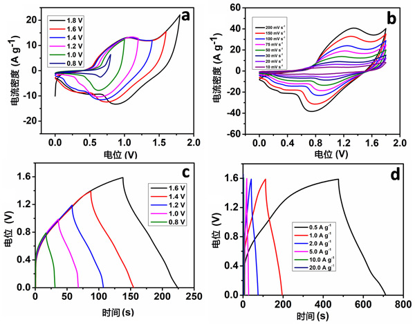 超級電容器裝置的制造是集成陰極(氧化鎳),陽極(活性炭)使用纖維素濾紙(在2.0M/KOH電解液中浸泡放置)分離,然后用絕緣膠帶包裹。陽極和陰極具有相似的幾何表面積,再經(jīng)過合適的重量比來制成電容器。圖2a顯示了超級電容器件在各種截止區(qū)域中的CV曲線,掃描速率為50mVs-1。從圖中可以看出,電容器件的CV曲線呈現(xiàn)出典型的準(zhǔn)矩形電容性能,這對應(yīng)于雙電層電容器和贗電容的相互貢獻。此外,當(dāng)增加工作截止區(qū)時,會發(fā)生更多的法拉第電化學(xué)反應(yīng)。當(dāng)工作電位超過1.7V時,也會在CV曲線上注意到氧氣的釋放。活性炭/氧化鎳器件很大程度上取決于截止區(qū)域。因此,選擇1.6V作為隨后研究超級電容器件電化學(xué)性能的潛在窗口區(qū)域。圖2b顯示了活性炭電容器件在0到1.6V的截止區(qū)域內(nèi)的各種掃描速率下的CV曲線。電流密度隨著掃描速率的增加而增加,并且氧化峰電位轉(zhuǎn)移到更正的電位,類似三電極器件的結(jié)果。