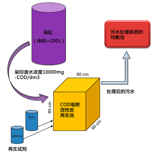 活性炭吸附處理高COD染色廢水,研究中使用5g活性炭從60mL分散的富含染料的廢水中吸附50-60%的COD。所用活性炭的吸附容量約為0.165g-COD/g-活性炭。在使用活性炭進行COD吸附操作期間,無需調(diào)整pH或溫度。總體而言,使用活性炭吸附濃縮印染廢水的COD,其次是乙二胺四乙酸鐵鈉催化,飽和活性炭的過氧化物氧化處理可能是去除高COD染色廢水的有前景的替代方案,其氧化劑更少,COD處理效率更高。并且提出了一個按比例放大的200L吸附-再生裝置,并解決了其操作過程和潛在限制。