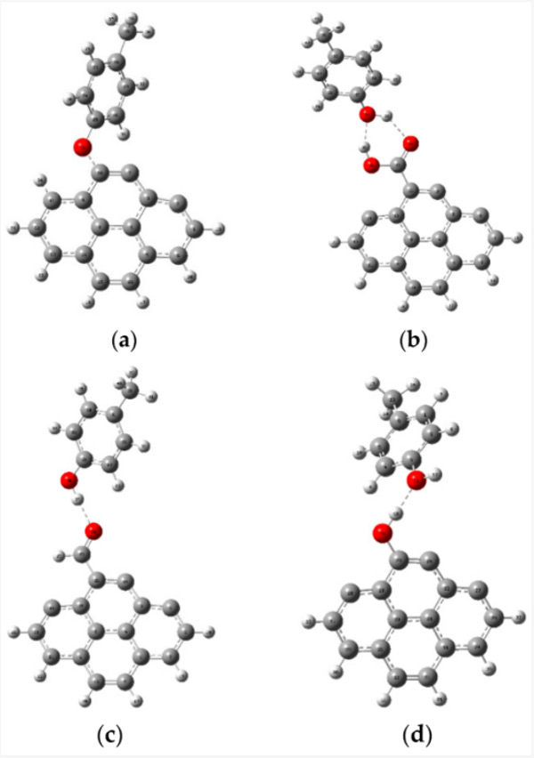 預(yù)計(jì)甲酚在活性炭上的吸附將通過(guò)各種類(lèi)型的相互作用進(jìn)行,例如電子供體-受體機(jī)制、靜電相互作用、π-π相互作用和氫鍵形成。然而,在各種類(lèi)型的相互作用中,活性炭和被吸附物之間的氫鍵是有助于吸附過(guò)程的重要相互作用類(lèi)型之一。因此,在本研究中,使用DFT方法研究了對(duì)甲酚和活性炭之間的氫鍵相互作用?紤]到它們之間的氫鍵,研究了對(duì)甲酚與原始活性炭和功能化活性炭的相互作用。圖1代表各種相互作用的優(yōu)化結(jié)構(gòu)。