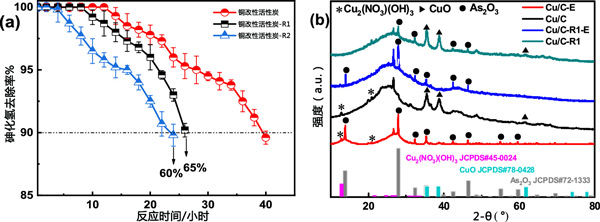 銅改性活性炭通過水洗和吹掃氣體法進行再生。為此,活性炭樣品首先在100℃的熱空氣中活化3小時。然后用去離子水浸泡清洗4-5次,放入電熱風烘箱中110-120℃烘干。之后,將樣品置于氮氣氣氛下的管式爐中,并使用程序升溫控制器升高溫度?紤]到通過在180℃下烘烤獲得的材料,溫度首先設定在20-180℃。之后,停止加熱,將樣品冷卻至室溫。取出樣品,停止氮氣流,對再生材料進行測試。如圖3a所示,R的再生效率(R為再生吸附劑與新鮮吸附劑的穿透時間之比)在一個再生循環(huán)后為65%。在第二次再生循環(huán)后,樣品恢復效率R達到60%,證實了活性炭吸附劑對去除AsH3具有合理的再生能力。為了確定活性炭吸附劑再生后表面相的變化,通過XRD分析活性炭吸附劑。如圖3b所示,再生后活性炭-R1中35.6°、38.8°和61.8°的CuO衍射峰強度明顯增加,但沒有Cu2(NO3)峰被找到。這表明在再生過程中回收的一些CuO物種可能被中間體Cu2(NO3)(OH)3轉化。此外,活性炭-R1樣品中As2O3在28.0°、32.2°、35.5°、42.6°、46.4°、55.0°和59.6°處的結晶峰明顯減弱。推測中間體Cu2(NO3)(OH)3向吸附活性中心CuO的轉變和結晶As2O3的分離可能是活性炭吸附劑再生性能好的原因。