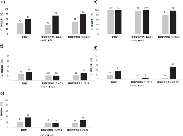使用帶有攪拌的恒溫浴用于浸出測(cè)試,該測(cè)試在90℃和250rpm下在250mL硼硅酸鹽玻璃罐中使用H2SO4溶液(在pH值1)濃度為5gL-1的Fe(III)。在浸出過(guò)程中控制溫度(90℃)和攪拌速度(250rpm),直到48和96小時(shí)。浸出劑溶液的Eh為547mV。硫酸的純度和硫酸鐵(III)分別為97%和99.5%。在每個(gè)實(shí)驗(yàn)中,在硼硅酸鹽玻璃罐中稱量2.5g。除對(duì)照外,活性炭比為1/0.5和1/0.25。然后,加入50mL浸出劑。使用兩個(gè)反應(yīng)時(shí)間對(duì)每種活性炭混合物進(jìn)行兩次浸出實(shí)驗(yàn):第一次直到48小時(shí),第二次直到96小時(shí)。在浸出實(shí)驗(yàn)期間,每24小時(shí)打開一次罐子,以確保浸出系統(tǒng)有足夠的氧合。在反應(yīng)結(jié)束時(shí)(48小時(shí)和96小時(shí)),將紙漿過(guò)濾并用50mL/H2SO4洗滌兩次pH2的溶液以回收吸附在活性炭表面上的金屬。通過(guò)測(cè)定浸出和洗滌溶液中的Cu、Zn、As、Co和Sb的含量。