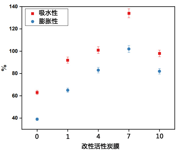 圖3:原始聚醚砜膜和改性活性炭結(jié)合的聚醚砜膜的WU和溶脹百分比。