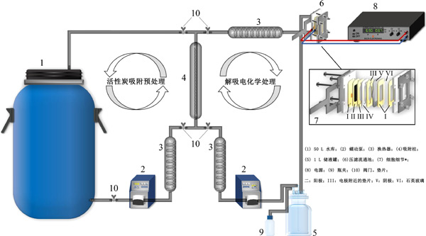 制備含有300mg/L-1苯的甲醇溶液和含有50mmol/L-1電解質(zhì)(H2SO4)的水介質(zhì),以確定污染物的去除效率。初始pH值約為1.5,在電化學(xué)過程測(cè)試期間未觀察到顯著變化。使用包含電極作為陽極和鈦板作為陰極的單隔室壓濾流動(dòng)池(在圖1中詳細(xì)表示)進(jìn)行電解,其具有13.5cm2的明顯幾何面積。兩個(gè)電極由墊片隔開,距離為4毫米。使用含有1L溶液的夾套玻璃容器,蠕動(dòng)泵以1L/min-1的速度將溶液泵入熱交換器,然后循環(huán)通過電池。使用恒溫浴將溫度控制在25℃。在恒電流模式下以50mA/cm-2的電流密度進(jìn)行電解。使用前,將陽極在H 2 SO4/0.05mol/L-1溶液中以40mA/cm-2極化20分鐘, 以從其表面去除任何雜質(zhì)。電化學(xué)實(shí)驗(yàn)一式三份進(jìn)行。