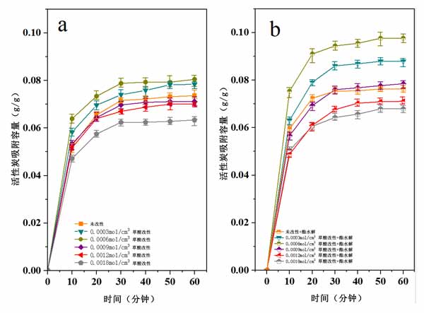 圖2:相同溫度和濕度和不同改性方法下活性炭的靜態(tài)吸附曲線。(a)相同溫度和濕度下不同濃度草酸改性活性炭的水蒸氣靜態(tài)吸附曲線。(b)相同溫度和濕度下不同濃度草酸+酯水解改性活性炭的水蒸氣靜態(tài)吸附曲線。
