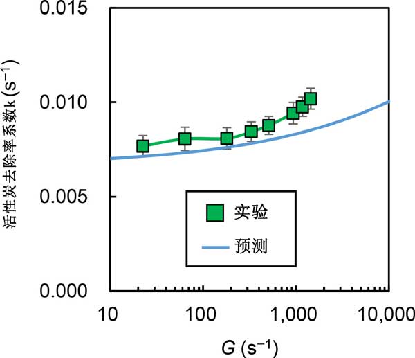 我們研究了混合強(qiáng)度對(duì)去除率系數(shù)(k)的影響(圖1)。我們繪制了實(shí)驗(yàn)數(shù)據(jù),實(shí)線顯示了方程式預(yù)測(cè)的值。實(shí)驗(yàn)結(jié)果和預(yù)測(cè)結(jié)果都表明,去除率系數(shù)隨著混合強(qiáng)度的增加而增加,但在G>1000s-1的范圍內(nèi),實(shí)驗(yàn)結(jié)果的增加率變得更陡峭,偏離預(yù)測(cè)的速率系數(shù)值。我們假設(shè)偏差背后的急劇增加是由于活性炭顆粒在高混合強(qiáng)度下的分解(在給炭時(shí)輕度聚集)。這些預(yù)測(cè)是在假設(shè)活性炭顆粒的尺寸(部分聚集在原料懸浮液中)在給炭后保持不變的情況下做出的,因?yàn)樵活w粒尺寸測(cè)量是不可能的。如果這個(gè)假設(shè)是正確的,那么去除率系數(shù)隨著混合強(qiáng)度的急劇增加,在高G對(duì)于在給炭時(shí)已經(jīng)處于分散狀態(tài)的活性炭顆粒,不應(yīng)觀察到-值范圍。為了驗(yàn)證這一假設(shè),我們使用了非聚集活性炭,其粒徑在分散處理前后沒(méi)有變化,我們?cè)诓煌幕旌蠌?qiáng)度。我們沒(méi)有觀察到隨著活性炭混合強(qiáng)度的增加,去除率系數(shù)的急劇增加,強(qiáng)烈表明觀察到的活性炭的急劇增加是由于高混合條件下的顆粒分解。