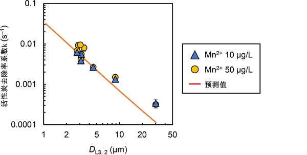 我們將Mn2+去除率系數(shù)(k)與活性炭的粒徑進(jìn)行了比較(圖3)。我們使用源自相同活性炭的九種尺寸的碳顆粒繪制了實(shí)驗(yàn)數(shù)據(jù),以便與方程式的預(yù)測(cè)進(jìn)行比較。實(shí)驗(yàn)值和預(yù)測(cè)值幾乎一致,并且在雙對(duì)數(shù)圖上都顯示出線性關(guān)系。仔細(xì)觀察發(fā)現(xiàn),預(yù)測(cè)值的斜率比實(shí)驗(yàn)值更陡,在較大顆粒范圍內(nèi),實(shí)驗(yàn)值略大于預(yù)測(cè)值。這可能是由于顆粒形狀或表面性質(zhì)的任何差異:我們假設(shè)了一系列參數(shù)值,包括球形值,這些預(yù)測(cè)與顆粒大小無(wú)關(guān),但在實(shí)際的活性炭中,這些值可能隨顆粒大小而變化。總體而言,活性炭的粒徑對(duì)Mn2+去除性能有很大影響。