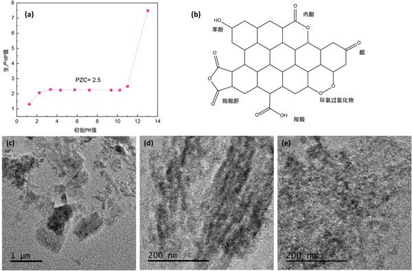 圖1:活性炭載體的研究:(a)零電荷點(PZC)的測定:反應(yīng)24小時后所得pH值作為起始pH值的函數(shù)。(b)不同含氧基團(tuán)。