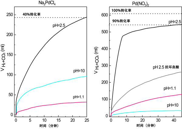 兩種不同的Pd前驅(qū)體在不同浸漬pH下制備的活性炭催化劑在60℃時產(chǎn)生的重整氣體(H2+CO2)的體積隨時間的變化曲線圖在圖2顯示。由于甲酸鈉添加劑對甲酸脫氫的促進(jìn)作用,催化測試在存在的情況下進(jìn)行]。所有制備的樣品都顯示出研究反應(yīng)的活性。正如在當(dāng)前測試條件下所預(yù)期的,曲線的形狀遵循甲酸中的一級動力學(xué)。為了更好地理解析氫曲線,我們測量了不同階段的反應(yīng)pH值:分散催化劑和甲酸鈉在60℃攪拌30分鐘后,注入甲酸后,當(dāng)反應(yīng)開始時和使用Na2PdCl4制備的催化劑系列反應(yīng)25分鐘后和Pd(NO3)2系列反應(yīng)40分鐘后,根據(jù)圖7所示的曲線。表明在所有樣品的反應(yīng)過程中,甲酸+甲酸鈉緩沖液的初始pH值保持不變,除了使用Pd(NO3)2制備的樣品,在pH值2.5下浸漬并用銻還原。對于該樣品,反應(yīng)40分鐘后的pH值為8.2,表明緩沖條件的喪失和甲酸的總消耗量與實現(xiàn)的90%甲酸轉(zhuǎn)化率一致。對于該系列的其余部分,pH測量值表明甲酸并未完全消耗,這與實現(xiàn)的轉(zhuǎn)化率一致。