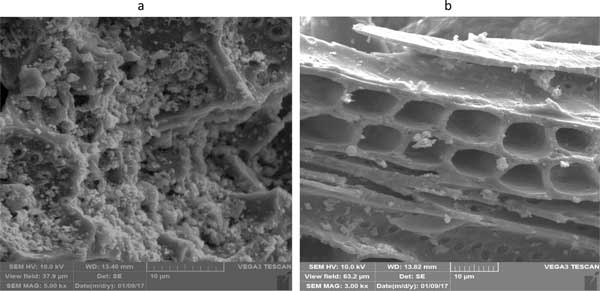 如前所述,通過掃描電子顯微鏡(SEM)評估了未提取和提取的活性炭樣品的結構和表面形態(tài)。圖3a、b顯示了活性炭在超臨界再生之前(a)和之后(b)的兩張顯微照片。未處理樣品的顯微照片顯示不均勻且粗糙的表面均勻覆蓋有一層溶質。由于用超臨界二氧化碳萃取獲得的高回收效率,處理過的樣品的結構更加多孔,表面明顯收縮并耗盡溶質。