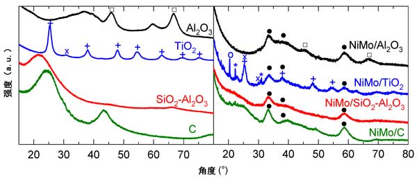 本工作的目的是研究HDO/HDS催化劑失活的第一種方法,即載體的結(jié)構(gòu)和質(zhì)地變化。選擇高表面積和介孔的Al2O3、TiO2、SiO2-Al2O3載體來沉積NiMo硫化物,用于辛酸加氫脫氧和1-苯并噻吩HDS在1.6MPa和330℃下的平行反應(yīng)。中孔的高表面積應(yīng)該能夠分散NiMo相的高負(fù)載量。這些中孔載體的薄壁應(yīng)該對(duì)H2O和/或酸性CO2/H2的破壞更敏感催化劑前體和HDO/HDS還原硫化過程中的O混合物。由于其惰性和高HDO/HDS活性,已選擇活性炭進(jìn)行比較。因此,我們分別使用XRD和氮?dú)馕锢砦疥U明了HDO/HDS后載體、硫化物催化劑和硫化物催化劑的結(jié)構(gòu)和質(zhì)地特性。