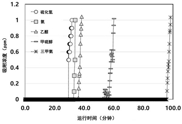 為了評估活性炭對不同廢氣的有效吸附量,應(yīng)研究其吸附能力。廢氣的氣味閾值和刺激水平在十億分之一的水平。吸附劑的總吸附容量很難用作從廢物中去除廢氣的設(shè)備的設(shè)計(jì)因素。因此,我們根據(jù)突破點(diǎn)計(jì)算了小于1ppm的有效吸附量。突破柱實(shí)驗(yàn)在304不銹鋼管式反應(yīng)器中進(jìn)行,總流量為1L/min,其中包含硫化氫(H2S)、氨(NH3)、乙醛(AA)、甲硫醇(MM)和三甲胺(TMA),如圖2所示。突破曲線依次為H2S、NH3、AA、MM、TMA。與廢氣相比,TMA具有更好的動態(tài)吸附性能,因?yàn)樗哂懈L的突破時(shí)間和相應(yīng)的更大的有效吸附容量(<1ppm)。