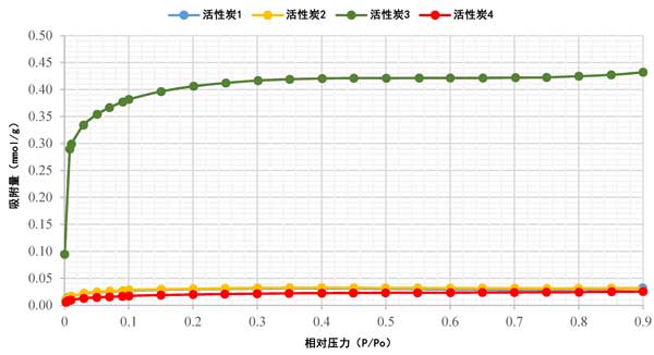 活性炭的吸附等溫線已使用氮(N2)吸附分析技術(一種標準方法)進行了研究。圖2顯示了活性炭在77K時的N2吸附等溫線,該等溫線被發(fā)現(xiàn)為I型等溫線。N2吸附在低相對壓力范圍內的快速上升證實了所有樣品都存在小孢子,如圖2所示。很明顯,活性炭4具有最低的N2吸附,而活性炭1和活性炭2的吸附等溫線重疊,活性炭3具有最高的N2吸附。數(shù)據(jù)的這種可變性可能歸因于所使用的不同前體材料。此外,除活性炭3外,活性炭的大部分孔隙體積都填充在P/Po≈0.1以下。對于活性炭3,孔體積填充低于P/Po≈0.3。在初始增加到0.1后,等溫線逐漸彎曲,表明進一步吸附的增量較小。隨著相對壓力的增加,所有樣品的吸附幾乎呈水平狀態(tài),表明已經(jīng)達到飽和。