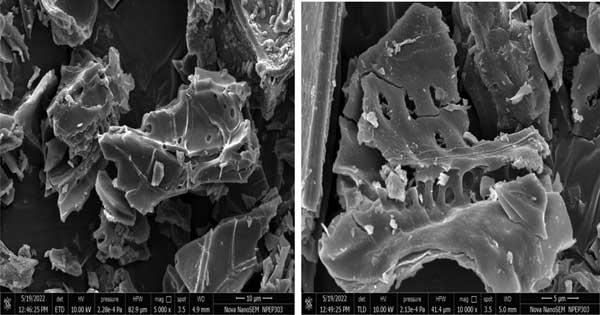 使用掃描電子顯微鏡分析獲得的活性炭的孔結(jié)構(gòu)。SEM設(shè)備具有超高分辨率低電壓成像和獨特的低真空能力。SEM圖像是在15kV時以1nm、1kV時1.4nm、3kV時1.8nm和30Pa的不同分辨率拍攝的。觀察活性炭的表面物理形態(tài)是通過使用SEM完成的技術(shù)。圖3顯示活性炭的SEM圖像。這表明活性炭的外表面具有均勻開放的大孔。此外,活性炭的表面是高度多孔的,其特點是不均勻。同樣清楚的是,活性炭在其外表面具有微孔和空腔,暗區(qū)位于該處。經(jīng)受碳化后,活性炭由于ZnCl2的蒸發(fā)而產(chǎn)生空隙(稱為氣孔)?梢詫⑦@些孔視為通向微孔網(wǎng)絡的通道。