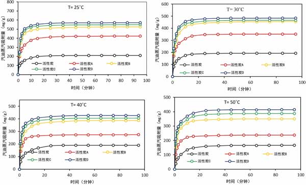 經(jīng)過進一步研究,發(fā)現(xiàn)活性炭D樣品比其他樣品更能增強汽油蒸汽吸附,這表明表面結構在捕獲分子方面的重要性和關鍵作用,正如預期的增強吸附一樣。事實上,與其他合成樣品相比,活性炭樣品具有更高的表面積和豐富的微介孔,可以顯著提高吸附量圖2。我們還研究了活性炭用量對吸附容量的影響。正如發(fā)現(xiàn)的那樣,隨著活性炭的用量增加,蒸汽吸附能力可以進一步提高,這可能是由于通過提高活性炭量,表面積和孔隙反而增加,進而可能有助于增強吸附。鑒于發(fā)現(xiàn)隨著活性炭用量比從1增加到4,汽油蒸氣吸附能力提高。