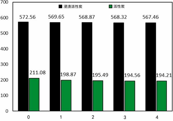 為了研究吸附劑吸收汽油蒸汽的性能,我們進一步評估了樣品在吸附-解吸循環(huán)中的可重復使用性。在恒溫下,1小時后,當吸附劑達到飽和狀態(tài)時,浸漬再生過程。四個吸附循環(huán)后,蒸汽吸附容量為567mg/g,所用吸附劑保持大量吸收分子。HMTA-AC-D樣品表明蒸汽吸收略有減少約0.89%,而活性炭樣品的這一量為7.9%(圖3)。在高循環(huán)下,由于孔隙的逐漸破壞和不完全脫氣,吸收量可能會顯著降低。根據(jù)我們的發(fā)現(xiàn),與文獻相比,制成的吸附劑在物理和熱學上表現(xiàn)出更高的穩(wěn)定性。這些結果表明,樣品在回收汽油蒸汽時具有很高的可持續(xù)性,可以作為一種有效的吸附劑提出并考慮。