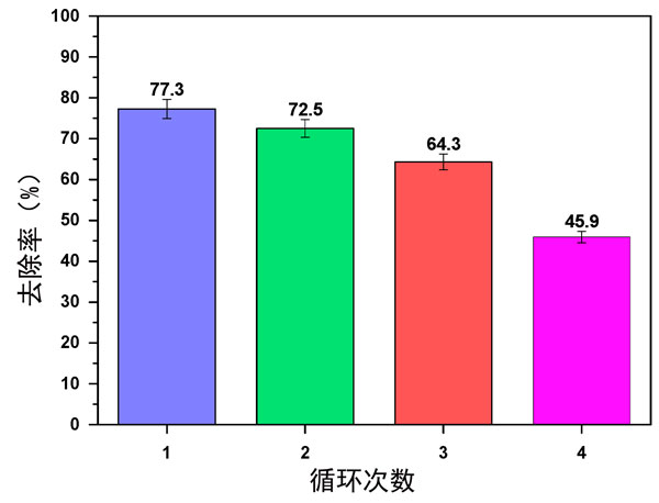 圖3:改性活性炭上的活性黑5在堿性pH值下再生后進(jìn)行四個(gè)吸附-解吸循環(huán)。