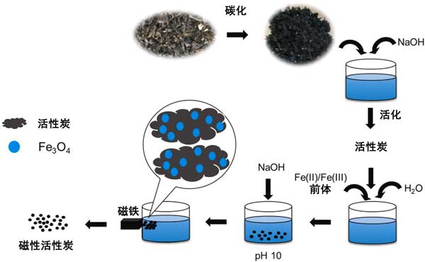 磁性活性炭的合成是通過將活性炭、Fe(II)和Fe(III)前體以w/n/n(1:1:2)的比例混合并添加H2O至體積150mL來進行的。的混合物。然后將溶液在60℃下混合30分鐘。之后,逐漸添加10M/NaOH直至混合物的pH變?yōu)?0。達到pH10后,將懸浮液混合物攪拌60分鐘并靜置過夜。之后,使用外部磁鐵將形成的活性炭材料從溶液中分離并使用H2O和C2H5OH洗滌。將獲得的固體在50℃溫度的烘箱中干燥。碳化過程的目的是使用爐子在400℃的溫度下持續(xù)2.5小時獲取木炭。然后使用NaOH活化木炭并進入下一階段(圖1)。經過處理,205克原料產生了31.6克活性炭。在炭化過程中,發(fā)生了幾個變化,在烘烤過程中變黑并比之前稍干,在爐內顏色變黑并干燥。