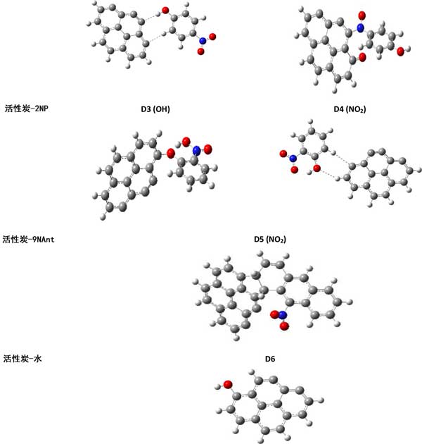 圖1:污染物和水與活性炭連接形成兩個分子聚集體的優(yōu)化結(jié)構(gòu)。