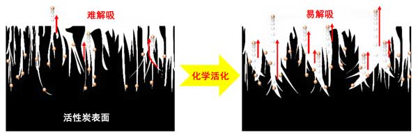 活性炭表面微孔體積與外部孔體積之比越高,解吸反應(yīng)就越困難,因為已吸附的氣體必須通過復(fù)雜而長的通道釋放。相反,較低對應(yīng)于表面上較大體積的大直徑孔。即使吸附物被深深地吸附到活性炭表面,解吸反應(yīng)也可以沿著寬闊而簡單的通道輕松快速地進行。也就是說,活性炭表面的比率越高,解吸反應(yīng)受到的抑制程度就越大,從而導(dǎo)致吸附容量越高。