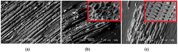 圖中顯示了活性炭和對(duì)比材料的SEM背散射電子圖像(BSI)?梢钥闯觯钚蕴科浔砻嫔暇哂信帕辛己玫目紫。然而,由于高分子量揮發(fā)物的釋放,鋸末的纖維結(jié)構(gòu)在熱解后被改變,這影響了孔的數(shù)量和直徑,觀察到尺寸為9-16μm的較小的孔和尺寸為21-48μm的較大的孔。這也表明,形成了幾個(gè)良好的方向微孔與尖銳和彎曲的邊緣形成?紫堵试黾,由于脂族C結(jié)構(gòu)與芳族C結(jié)構(gòu)變換。