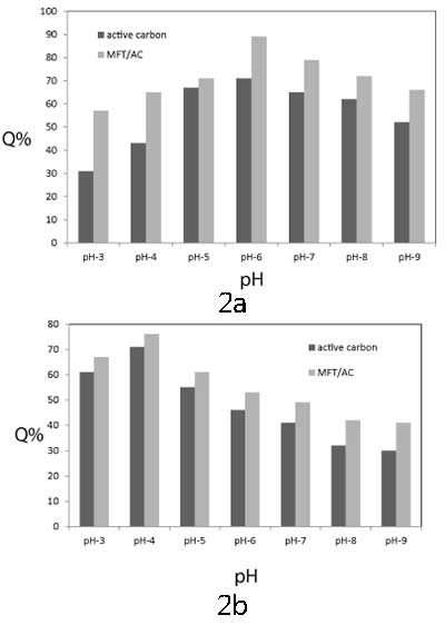 初始pH的影響:初始pH對鉻和鋅離子的去除效率的影響在pH(3-9)的范圍內(nèi)進(jìn)行研究,并在(圖2a和2b)中表示。通過在含有50mL初始濃度為100mg / L的50mL重金屬溶液的燒杯中,將0.05g MFT/活性炭或活性炭浸泡在25℃下,并且以210KHz聲強度,以7.7W /厘米1小時。如圖2所示,由于pH影響金屬離子和MFT官能團(tuán)的化學(xué)性質(zhì),MFT / 活性炭從水溶液中去除中的金屬離子是pH依賴性過程。在所有pH值范圍內(nèi),MFT / 活性炭的去除系數(shù)大于活性炭的去除系數(shù)。對于鉻離子,去除Cr 3+的系數(shù)離子從pH3增加到6,在pH6達(dá)到最大值。在pH = 6時,約91%的鉻離子從溶液中去除。在pH范圍(7 - 9),去除系數(shù)略有下降。對于鋅離子,去除系數(shù)在pH4時達(dá)到最大值,鋅離子去除率達(dá)到74%,然后明顯下降。在中性或微酸性介質(zhì)中,吸收可能是由于樹脂 - 金屬離子絡(luò)合物的穩(wěn)定形成,由于配位羧酸根釋放H+,可能導(dǎo)致介質(zhì)酸度增加。在較高的pH值下,重金屬離子將水解成Cr(OH)+和Zn(OH)+,因此,重金屬正電荷減少到+1,這使得與螯合劑的低相互作用除了金屬氫氧化物可以沉淀。
