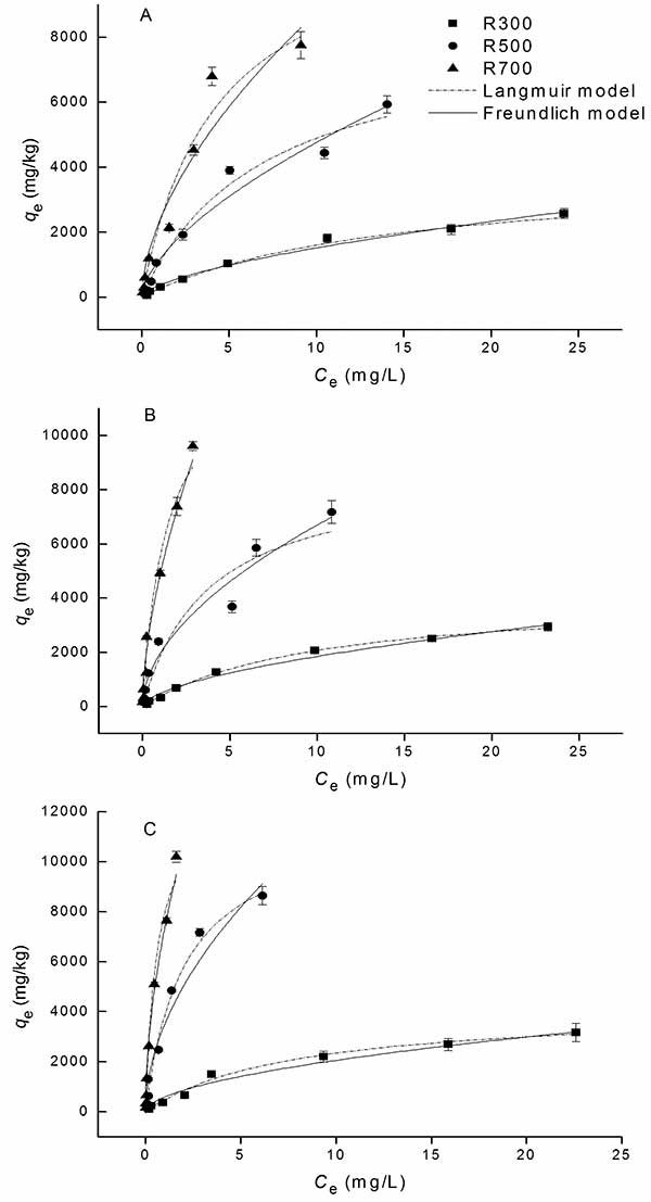 活性炭樣品上四環(huán)素的吸附等溫線如圖1所示。吸附數(shù)據(jù)顯示與Langmuir和Freundlich模型都很好,R 2系數(shù)高于0.919 。對于Freundlich模型中的參數(shù),不同樣品的n值相近(0.53-0.62),小于1,說明吸附是濃度依賴性過程。反映樣品吸收四環(huán)素能力的K f的值在700℃熱解產(chǎn)生的活性炭中最高。q max表示的趨勢Langmuir模型中的值也表明吸附容量隨著熱解溫度的增加而增加。計算最大吸附容量在大約11,834-14,157mg / kg的范圍內(nèi)。表面積是已知的是影響活性炭的吸附能力的一個重要因素,尤其在去除四環(huán)素的情況下。這在本研究中得到證實,活性炭樣品的表面積(S BET)與q e值顯著正相關(guān)。在較高的熱解溫度下,活性炭樣品的表面積增加,吸附能力增加。