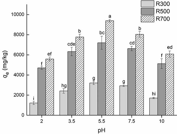 圖3. pH對活性炭吸附四氯化碳的吸附能力的影響。四環(huán)素溶液濃度為32mg / L。數(shù)值是三重均值±SD。字母表示處理之間在p <0.05水平上的顯著差異。