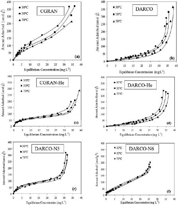 評估原樣處理的活性炭對松香酸的吸附情況,結果如圖1所示。該圖描繪了在處理前和后處理的CGRAN和DARCO活性炭的三種溫度(30,50和70℃)下作為平衡濃度函數(shù)的吸附容量。從先前對吸附速率的研究(此處未顯示),確定在30分鐘達到吸附平衡。根據(jù)分類等溫線,CGRAN和CGRAN-He(圖1a和1c)顯示了“L”型等溫線,這是樅酸和吸附位點之間強親和力的特征。DARCO(圖1b)和DARCO-He(圖1d)活性炭表現(xiàn)出“S”型等溫線,歸因于溶質(zhì)和溶劑之間競爭吸附的結果,松香酸對吸附位點的親和力較低。圖1e和1f所示的HNO3氧化樣品(DARCO-N3和DARCO-N6)的 等溫線為“L”型吸附等溫線,樅酸和溶劑之間具有強親和力的特征。26,27另外,DARCO-N3展示了一個被歸類為“L2”的等溫線,其中平臺指示表面上的所有可用位點均分布在單層中,并且DARCO-N6根據(jù)“L1”子群顯示等溫線,其中沒有觀察到高原,表明未覆蓋單層。 這種行為與DARCO-N6顯示的更多的表面功能組一致。