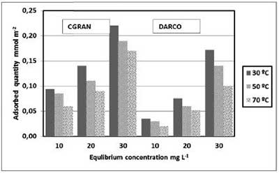 為了確定表面氧基團的具體影響,通過S BET將吸附容量標準化。如圖2所示,CGRAN活性炭具有比DARCO活性炭更高的松香酸吸附容量。在測試的三個溫度下觀察到CGRAN的更大的吸附容量。根據(jù)平衡濃度CGRAN的平均吸附能力高2-3倍。然而,由于更大的吸附潛力,這種差異在較高的平衡濃度值下降。表面積歸一化吸附量表明,氧官能團的存在對活性炭的吸附能力起著重要的作用。CGRAN的較高的吸附能力可通過的強酸位的存在來解釋(作為較高量的官能團的結果),有利于松香酸的吸附高達30毫克的L -1。對于DARCO活性炭來說,情況正好相反。