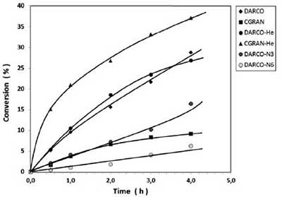 活性炭催化劑的活性在樅酸隨時間的變化中進行測試,如圖3所示。該圖顯示DARCO催化劑顯示比CGRAN催化劑更高的轉(zhuǎn)化率。圖3還比較了接受活化的碳催化劑與He處理的對應物的轉(zhuǎn)化率:CGRAN-He顯示出比CGRAN催化劑顯著更高的轉(zhuǎn)化率,這是與從TPD,F(xiàn)TIR和酸度結果推斷的表面氧基團數(shù)目較少有關的行為。DARCO和DARCO-He之間的轉(zhuǎn)化沒有明顯的差異,這與兩種催化劑中表面氧基團的量相似。沿同一線,比較DARCO和相應的硝酸氧化樣品的活性,如圖3所示。數(shù)據(jù)清楚地顯示了轉(zhuǎn)化率與HNO 3濃度之間的反比關系用于改性處理。因為在處理之后沒有明顯的變化,所以質(zhì)地特性的影響可以打折扣; 因此,這種行為顯然是酸強度和表面含氧基團的效應,從TPD,F(xiàn)TIR和總酸度結果得出的DARCO活性炭表面的化學修飾的證明。DARCO-N6催化劑的最低轉(zhuǎn)化率可以與它們的最高酸強度相關,而DARCO表現(xiàn)出的最高轉(zhuǎn)化率是由于它們的最低酸強度。這些結果表明,盡管強酸性位點有利于樅酸的吸附,但是它們會削弱催化活性。這些發(fā)現(xiàn)也表明這些位點對于催化裂化沒有活性。