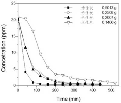 使用不同的質(zhì)量對活性炭的4-硝基酚吸附容量清楚地表明,在較低的質(zhì)量下,以mg g-1表示的吸附容量較高,盡管這是在較高的飽和時間獲得的。這偏離了預(yù)期,因為吸附容量應(yīng)該標準化為每克吸附劑,因此應(yīng)當獨立于所使用的吸附劑質(zhì)量。這個意想不到的結(jié)果主要是由于擴散問題,例如搖動,意味著當降低間歇系統(tǒng)中的擴散阻力時獲得更高的效率,導致4-硝基酚溶液更均勻的分布,同時溶液之間質(zhì)量增加的接觸減少和吸附劑。