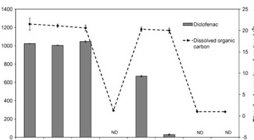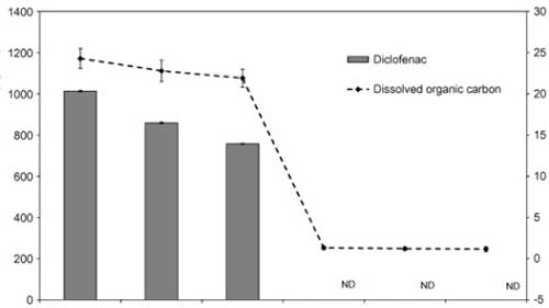 使用活性炭除去雙氯芬酸鈉是定性高效的,通過零吸收和低濃度的DOC的,并且在通過所獲得的色譜中沒有檢測到雙氯芬酸鈉。得在所研究的處理階段中,在活性炭上的吸附導(dǎo)致最顯著的雙氯芬酸鈉去除。因此,雙氯芬酸鈉沒有水樣中的這個階段(LOD之后檢測 = 2 μg L−1)?紤]到所述方法的定量限為3 μg L−1,通過活性炭除去雙氯芬酸鈉的至少99.7%。因為沒有研究活性炭的破裂曲線,所以活性炭的結(jié)果可以被認為是定性的。然而,為了研究在大型水處理廠中去除雙氯芬酸鈉,必須改​​進該方法以達到較低的檢測限(約μg L−1)。