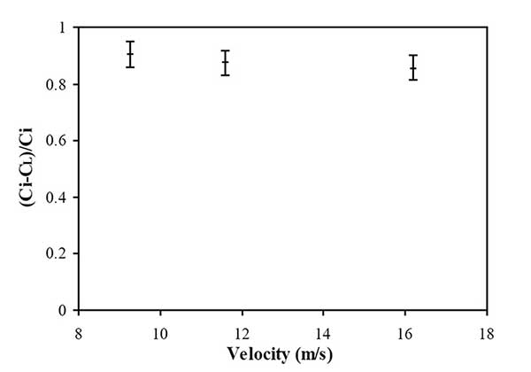 旋風(fēng)分離器系統(tǒng)對(duì)應(yīng)于具有強(qiáng)大的慣性力場的移動(dòng)床粒子。雖然活性炭尺寸和流速兩個(gè)參數(shù)在吸附過程中都起著關(guān)鍵作用,但顆粒尺寸有更明顯的趨勢。基于劇烈的湍流,高流速形成更好的混合條件,但使吸附劑顆粒的停留時(shí)間極短,這可能降低與旋風(fēng)分離器內(nèi)的目標(biāo)氣體流動(dòng)的接觸概率。例如,350升/分鐘(1pm)的流速導(dǎo)致16.2米/秒的入口速度,從而導(dǎo)致在旋風(fēng)分離器的混合室內(nèi)停留時(shí)間大約為0.14秒。因此,為了有效利用活性炭顆粒直至完全吸附,顆粒應(yīng)盡可能多次重復(fù)使用。