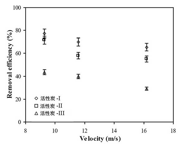 流速同時(shí)影響氣體吸附和活性炭回收,因?yàn)樗婕皻怏w和活性炭顆粒的混合程度、。圖3在各種活性炭吸附劑尺寸下,氣體去除效率和流量之間呈現(xiàn)出輕微的反比關(guān)系。最小的吸附劑(活性炭-1)以9.26米/秒除去77.4%的甲苯蒸氣,然后以16.2米/秒降至65.4%。微;钚蕴课絼┎东@沿著旋風(fēng)分離器的流動(dòng)路徑行進(jìn)的甲苯蒸氣。雖然在前面的的內(nèi)容說過吸附量以高速增加,但是氣體去除效率相當(dāng)?shù)。這是因?yàn)樵诟吡髁肯录妆降慕^對(duì)體積要高得多。因此,即使活性炭吸附得更多,更多的氣體分子傾向于流出而沒有在內(nèi)部吸收。因此,關(guān)于顆;厥蘸蜌怏w去除效率的最佳流量必須通過在各種操作條件下的眾多實(shí)驗(yàn)來確定。