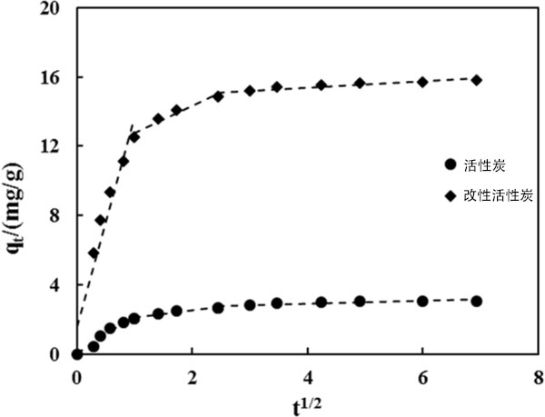 磺胺二甲嘧啶在活性炭和改性活性炭上的吸附和擴散過程可分三個階段描述,如圖2所示。由于在第一階段吸附在活性炭表面上,吸附速率最初很高。然后,發(fā)生快速的顆粒內(nèi)擴散過程,其中磺胺二甲嘧啶逐漸吸附在活性炭上,并且吸附速率常數(shù)逐漸降低。在第三階段,邊界層和傳質(zhì)阻力的影響增加,導致顆粒內(nèi)擴散減慢。所有三個階段的擬合方程都沒有通過坐標的原點,這表明顆粒內(nèi)擴散不是控制吸附速率的唯一步驟。因此,吸附過程也受膜擴散和表面吸附的影響。