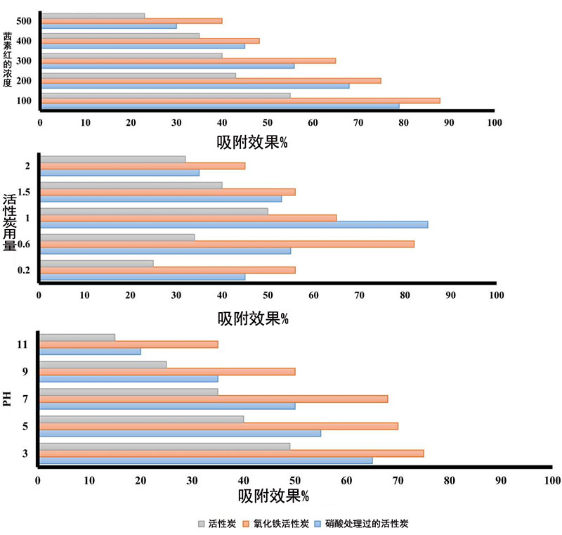 圖2:溶液pH,活性炭用量,染料初始濃度對(duì)活性炭,處理過的活性炭和氧化鐵活性炭納米復(fù)合物吸附茜素紅S的影響。