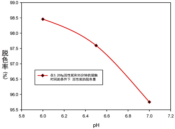 實驗過程中發(fā)現(xiàn),活性炭在較低的pH環(huán)境對顏色吸附效果得到大幅度增強(qiáng)。盡管如此,排放處理的酸性廢水的影響可能直接阻礙水生棲息地。鑒于此,使用預(yù)處理的活性炭吸附研究在6至7的可接受的pH范圍內(nèi)進(jìn)行?紤]的另外兩個因素是劑量和接觸時間,并且它們分別保持在3.208g和35min。從圖3中可以看出可以觀察到,顏色去除的百分比隨著pH的降低而增加。在pH6時獲得最高的顏色去除率98.46%,但隨著pH增加到7,顏色去除率降低到95.69%。