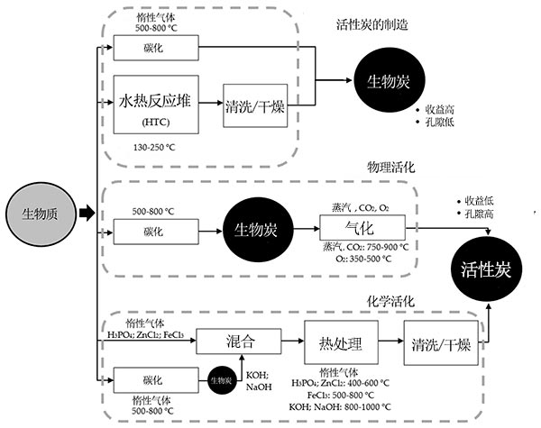 一般而言,活性炭吸附劑可以由其組成中具有高比例碳的任何前體制造。因此,生物質(zhì)材料是活性炭吸附劑的理想前體。在這項(xiàng)研究中,生物質(zhì)在熱處理后得到生物炭,生物炭經(jīng)過進(jìn)一步活化,而在活化步驟后獲得活性炭。常見的生物質(zhì)材料如橄欖核等等。圖2顯示了生物質(zhì)的活性炭制造方法。生物炭通常在碳化時(shí)制備,而活性炭需要使用物理和化學(xué)活化產(chǎn)生更加發(fā)達(dá)的孔隙。合成的活性炭的孔隙率,表面化學(xué)和產(chǎn)率高度依賴于起始生物質(zhì)組成和合成中使用的操作條件。