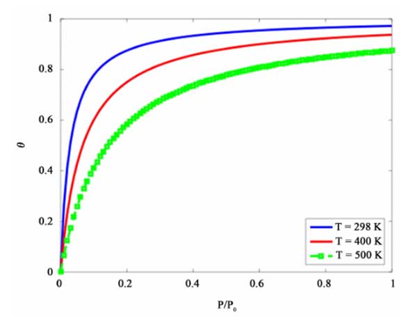 下圖(圖1)顯示了加載分?jǐn)?shù)θ與氣體壓力P/P0在不同溫度之間的定量關(guān)系。BET方程是模擬活性炭上氣體吸附動(dòng)力學(xué)的好方法,但它僅適用用于單組分氣體吸附。在下面的部分中,介紹了多組分油蒸氣回收的綜合模型。