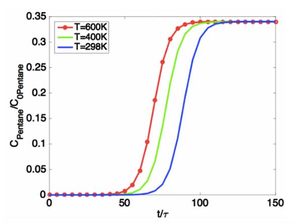 結(jié)果與討論我們已經(jīng)提出了一個(gè)綜合模型,該模型定量地預(yù)測(cè)了填充床反應(yīng)器中油蒸氣回收的吸附動(dòng)力學(xué)。在該模型中,我們僅考慮軸向擴(kuò)散,并使用質(zhì)量守恒方程來(lái)模擬油氣吸附的時(shí)空分布。我們假設(shè)活性炭吸附在恒溫下操作,并且與活性炭的吸附容量相比,油蒸氣濃度非常低。此外,假設(shè)油蒸氣中的組分之間不發(fā)生化學(xué)反應(yīng),因此每種組分可以作為獨(dú)立的吸附物處理。因此,多組分吸附問(wèn)題可以轉(zhuǎn)化為單組分吸附問(wèn)題。下圖(圖2)說(shuō)明了吸附動(dòng)力學(xué)的溫度依賴性。
