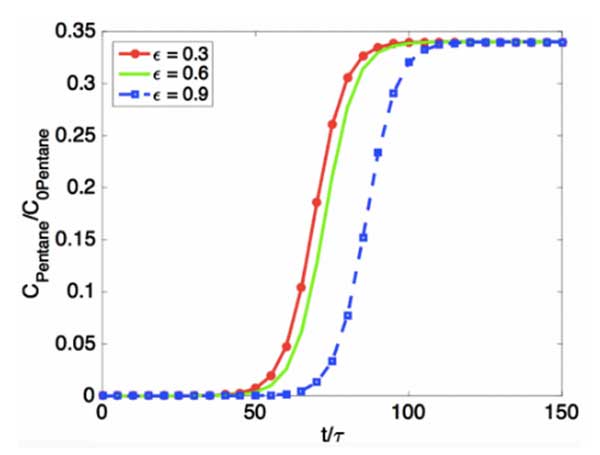 模擬三種不同孔隙率的活性炭的吸附動(dòng)力學(xué)(圖2)。通過(guò)多組分加權(quán)平均計(jì)算C/C0(我們模擬每種組分的吸附動(dòng)力學(xué),計(jì)算它們相應(yīng)的穿透曲線,并根據(jù)它們?cè)谠加驼魵庵械捏w積分?jǐn)?shù)得出加權(quán)平均值)。從圖3中可以看出,較高的孔隙率可以在較長(zhǎng)的穿透時(shí)間內(nèi)重新產(chǎn)生,這與較高的孔隙率將導(dǎo)致較高的表面積并且將使反應(yīng)器中的吸附物的停留時(shí)間更長(zhǎng)的事實(shí)一致。